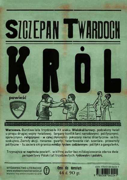 (...)co stanowi wielki plus tej powieści, klimat niemal plastyczny, lecz na tym owe plusy się kończą. Dominują minusy, mój niesmak i moje wielkie rozczarowanie. Szczepan Twardoch, autor, stał się sławny kilka lat temu. Pokazywał się wszędzie, udzielał wywiadów, reklamował książki własnego pióra oraz manifestował swoim wizerunkiem – intelektualnego przystojniaka dbającego o każdy detal zarówno w pisanych powieściach, jak i starannej prezencji samego siebie. Dobry gust to podstawa, brzmi za pewne jego motto. Dla mnie ktoś taki pazurami walczy o byt i sławę, bo powieści jego pióra same się nie wybijają. Nie mają szans. Jemu się co prawda udało, o czym świadczy zdobyty status jednego z najlepszych pisarzy naszego polskiego poletka literackiego oraz zdobyte nagrody czytelnicze, ale i tym też można wiele zarzucić. „Król” jest osadzony w tematyce żydowskiego półświatka, gangsterskiego podziemia (choć czasem ów żydówki klimat przeplata się z chrześcijaństwem, z jidysz, antysemityzmem, czy syjonizmem) i amatorowi trudno połapać się w tych mieszankach powieści. W tym całym miszmaszu, gdzie rządzą narkotyki, leje się wódka, prostytutki ulegają, a twoje miejsce w knajpie jest święte i nienaruszalne przez innego klienta. Kobiety są głupie, bite przez mężów w czterech ścianach własnych mieszkań, poniżane. Warszawa u Twardocha jest – bez owijania w ładne słowa – śmierdzącym silosem, kompostem społeczników. Nasza stolica spowita jest dusznym dymem tytoniowym, a korytami rzek płynie majona wódka. Brak poczucia własnej wartości, brak szacunku względem siebie, nie wspominając już o szacunku wobec innych. Tu wartość ma jedynie chwila obecna i zysk, najlepiej wymierny. Nic więcej. Byleby być na wierzchu. A że poleje się krew? Że będą ofiary? A czy to pierwszy raz? Wszystko kosztuje i wedle biblijnego przesłania, „coś za coś”. Ta książka jest obleśna. Sięgnęłam po nią tylko i wyłącznie z konieczności. Nie ukrywam – czekałam na petardę wyjątkowości. Wiele recenzji rozpływa się w anielskich zachwytach, a Twardoch jawi się w nich jako niebanalny pisarz, wyjątkowy wręcz, pisarz z wysokiej półki. Tak podeszłam do „Króla” i tak założyłam, że to będzie wyśmienita lektura. I co? Z mozołem dobiłam do sto pięćdziesiątej strony i poddałam się. Padłam na ring bokserski otumaniona szybkimi prawymi sierpowymi. I choć początek „Króla” mnie wkręcił, ba, wręcz bardzo zainteresował i udzielała mi się atmosfera sportowej ekscytacji walką na ringu. I choć poczułam się jak kibic siedzący obok Mosze Bernsztajna, późniejszego Mojżesza Inbara, patrzyłam na walczącego Jakuba Szapiro, mordercę na zlecenie, a kątem oka zerkałam na Kumę Kapicę, tak po setnej stronie straciłam cały entuzjazm. Gubiłam wątki, myliłam nowe postacie, stare zresztą też, bo pojawiają się inne ich imiona, nazwiska, czy pseudonimy. Nie łapiesz już ich przeszłości i wzajemnych korelacji. Żonglerka autora nijak ma się dla czytelnika, który nie zna żydowskiego półświatka powojennej Warszawy. Do tego wiecznie bicie, alkohol, poniżanie i mamona. I walka o władzę, o bycie Królem nawet we własnym domu.