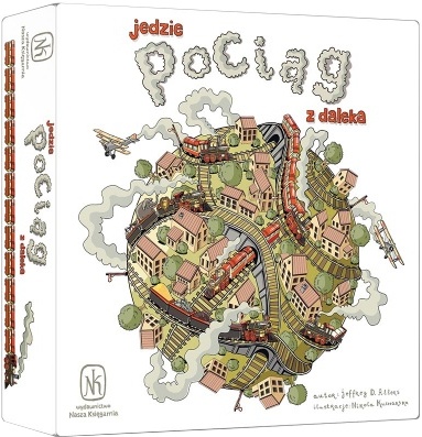 Jedzie pociąg z daleka / autor: Jeffrey D. Allers ; ilustracje: Nikola Kucharska. - Warszawa : Wydawnictwo "Nasza Księgarnia", © 2017. - 1 pudełko (4 ramki ze stacjami, 60 kafelków torów, 2 plansze punktacji, 4 małe żetony, 16 dużych żetonów, 16 lokomotyw, instrukcja) : ilustracje ; 26x26x6 cm.