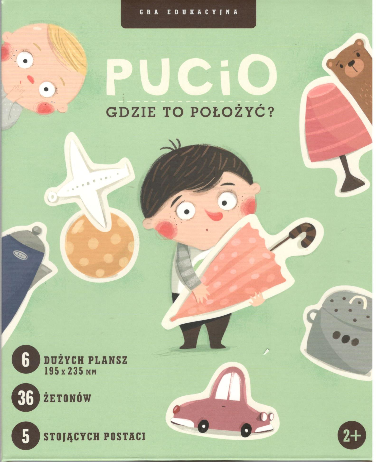 Pucio : gdzie to położyć? / autor Marta Galewska-Kustra ; ilustracje Joanna Kłos. - Warszawa : Wydawnictwo "Nasza Księgarnia", copyright 2020. - 1 pudełko (6 dużych plansz, 36 żetonów, 5 stojących postaci, instrukcja) : ilustracje ; 25x20x4 cm.