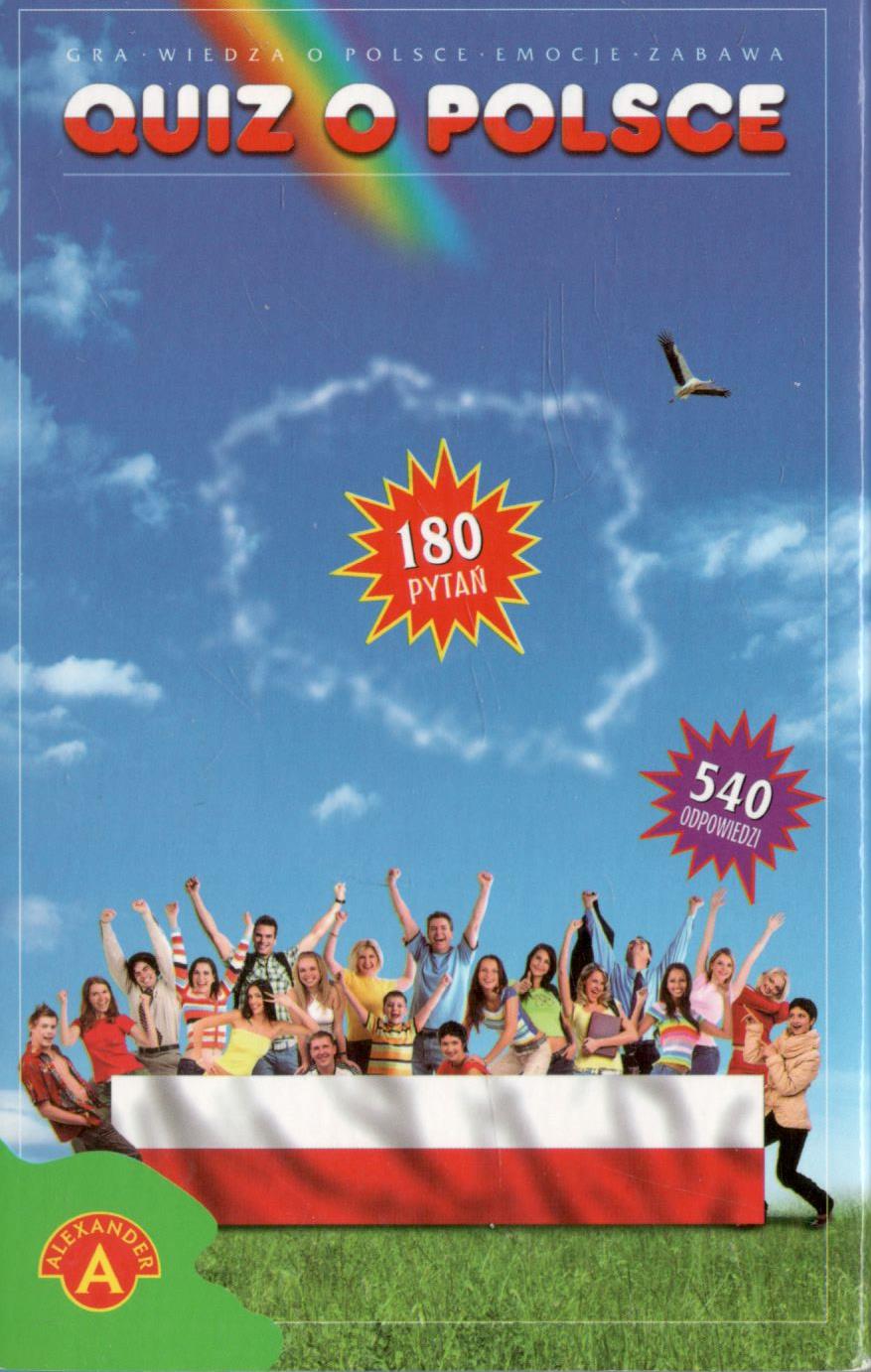 Quiz o Polsce. - Chwaszczyno k/Gdyni : Alexander, [2011]. - 1 pudełko (karty pytań i odpowiedzi - 45 szt., karty liter: a, b, c 3x3 szt., karta z nazwami działów - 1 szt., pionki do gry - 3 szt., kostka do gry, plansza, żetony - 36 szt., klepsydra - 1 szt., instrukcja) ; 18x12x4 cm.