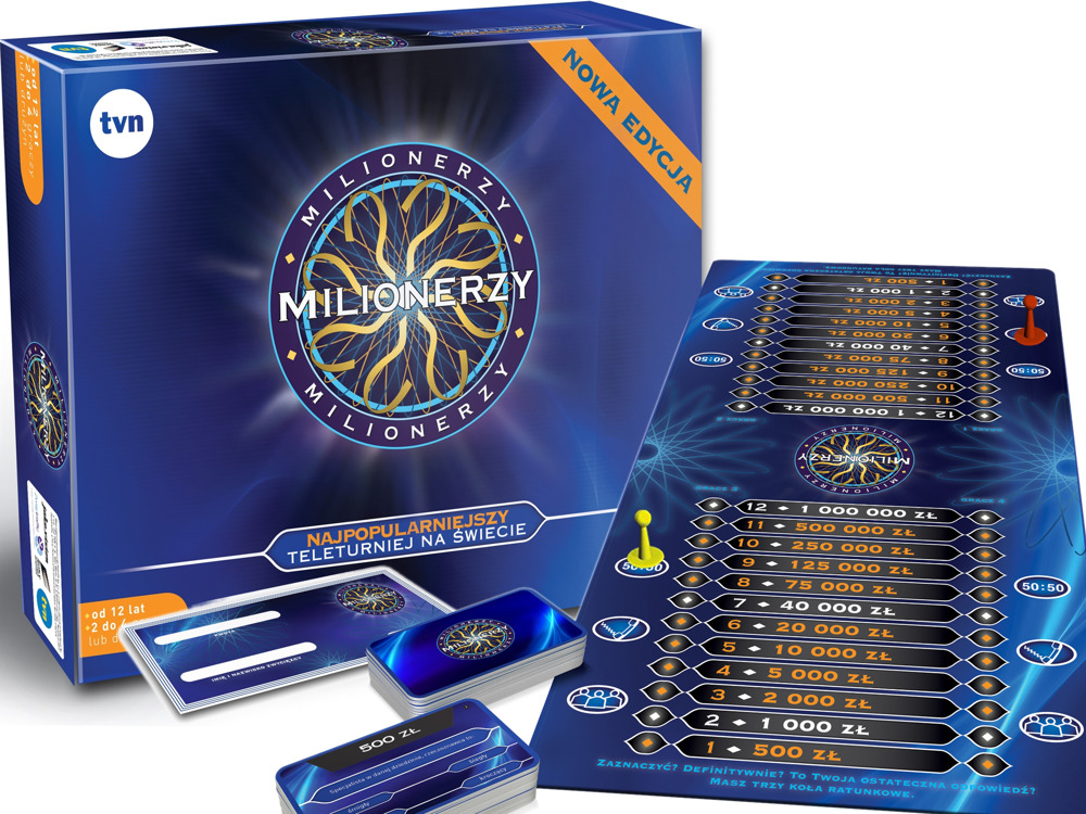 Milionerzy. - Nowa edycja. - Warszawa : EVO CE, © 2017. - 1 pudełko (1 plansza do gry, 4 ramki na karty Pytanie i Odpowiedź, 660 kart Pytanie i Odpowiedź, 20 kart Pytanie do publiczności/Telefon do przyjaciela, 12 żetonów Kół Ratunkowych, 6 pionków, 30 czeków, 7 kart dodatkowych z ciekawostkami, 1 instrukcja) ; 39x32x8 cm.