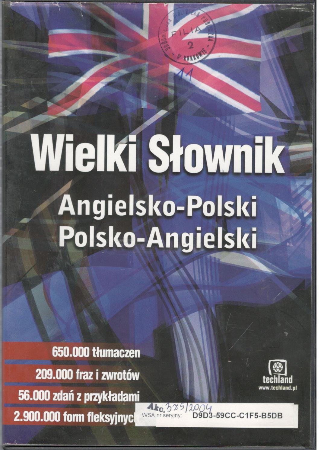 Wielki słownik angielsko-polski, polsko-angielski / [kier. projektu Leszek Wilk]. - Wersja 1.1. - Ostrów Wielkopolski : Techland, cop. 2002. - 1 dysk optyczny (CD) : dźw., kolor ; 12 cm.