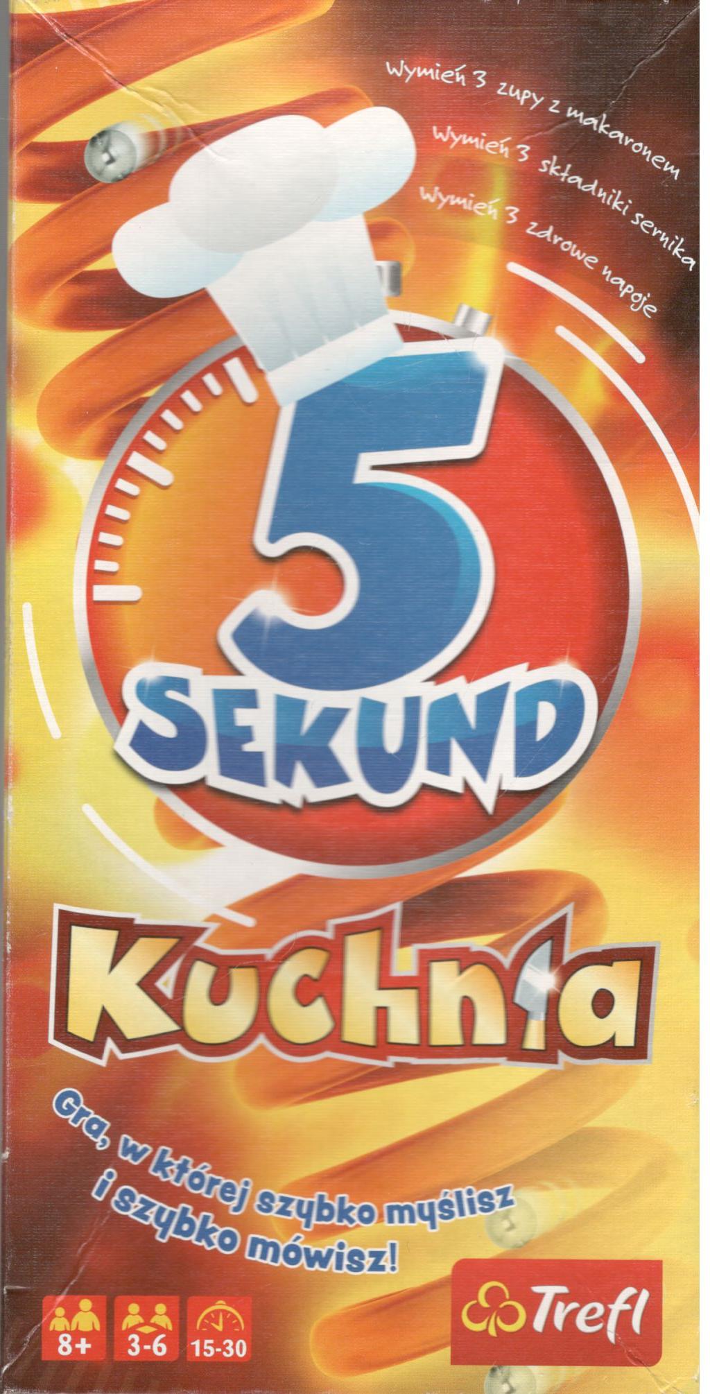 5 sekund malucha / opracowanie gry: Paulina Kortas, Adam Bukowski, Aleksandra Regulska, Jan Tomaszewicz ; opracowanie graficzne: Jan Tomaszewicz. - Gdynia : Trefl SA, copyright 2021. - 1 pudełko (144 karty z pytaniami (288 pytań), 6 kart "Czas", 6 kart "Zmiana", 1 specjalny czasomierz, instrukcja) ; 26x13x8 cm.