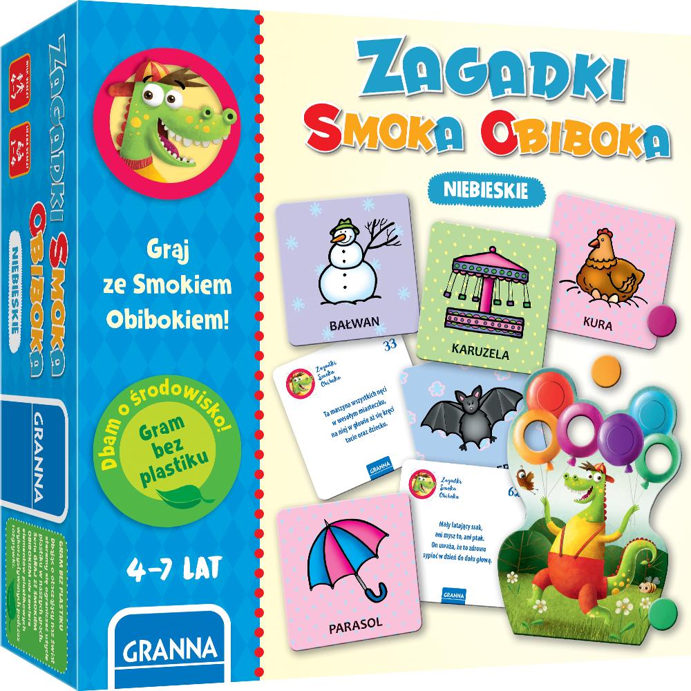 Zagadki Smoka Obiboka : niebieskie / [autor zagadek: Marek Bartkowicz ; ilustracje: Beata Batorska]. - Warszawa : Granna, copyright 2019. - 1 pudełko (117 kart z zagadkami, 4 plansze do zaznaczania prawidłowych odpowiedzi, 24 kolorowe żetony, instrukcja) : ilustracje ; 21x21x6 cm.